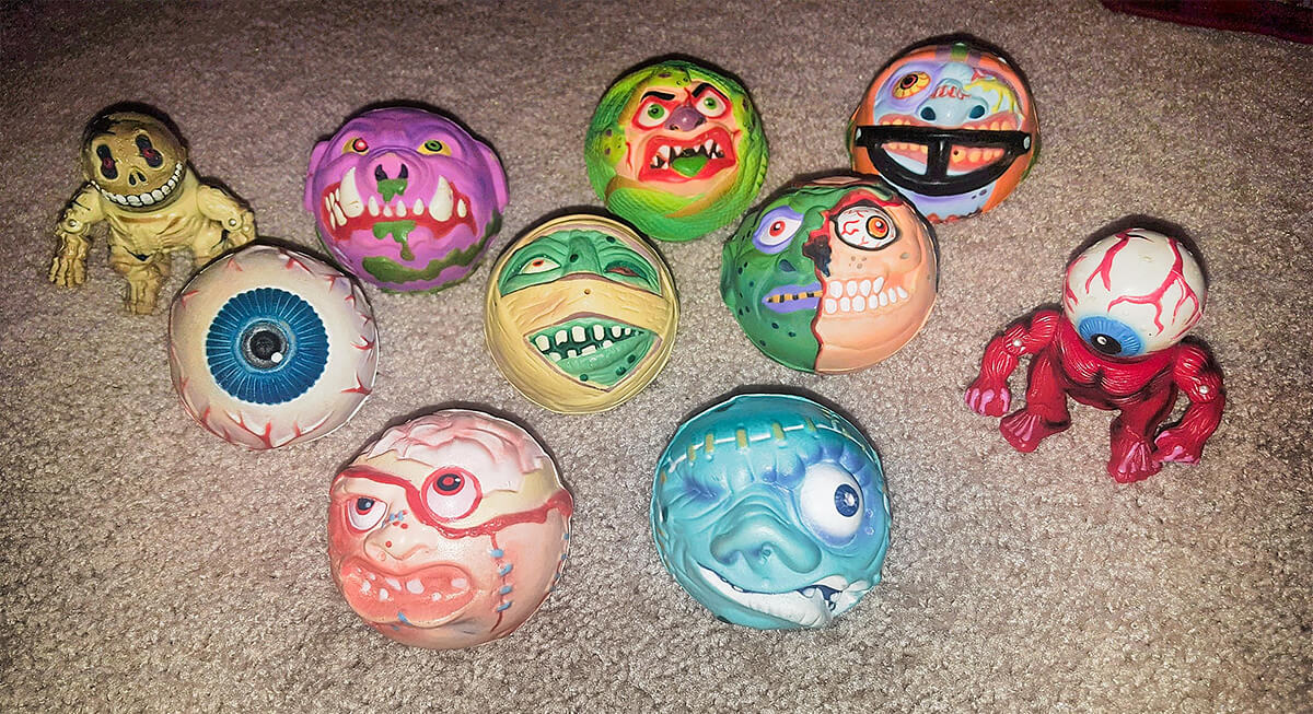 Madballs’ rubber balls looked like cartoon monsters with bulging eyes, fangs, scars, and stitched faces. The designs leaned heavily into the same gross-out comedy that fueled the Garbage Pail Kids craze. Certain versions even included wind-up features that made them move or produce sounds.