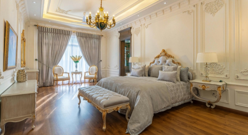 The mansion spans more than 13,800 square feet with five bedrooms and nine bathrooms. The standout primary suite alone measures over 2,000 square feet and includes dual bathrooms, dressing areas, and generous walk-in closets. The house also includes a library and other distinctive rooms designed to provide both formal and relaxed living spaces.
