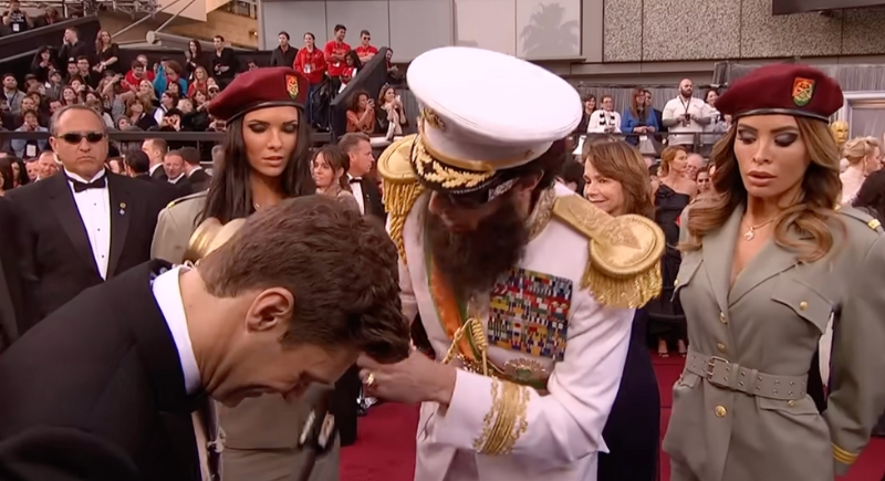 At the 2012 Oscars, Sacha Baron Cohen arrived in character from The Dictator, carrying a fake urn said to hold Kim Jong-il’s ashes. During an interview, he tipped it and dumped the contents onto Ryan Seacrest’s tuxedo. Seacrest stayed composed, but security moved in and escorted Cohen off moments later.