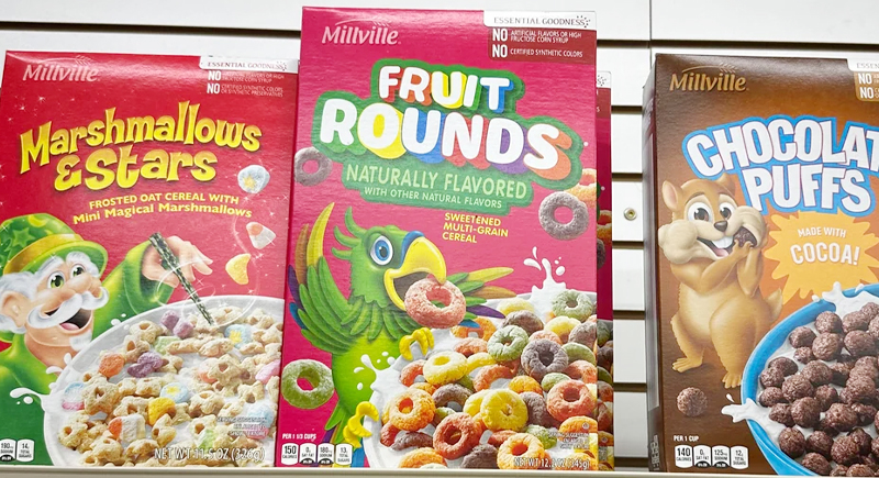 ALDI’s Millville cereals are tied to either General Mills or Post’s Malt-O-Meal. Packaging similarities, ingredient lists, and product form suggest the same manufacturers are behind national brands and ALDI’s versions. The store-brand price is typically 20–30% lower.