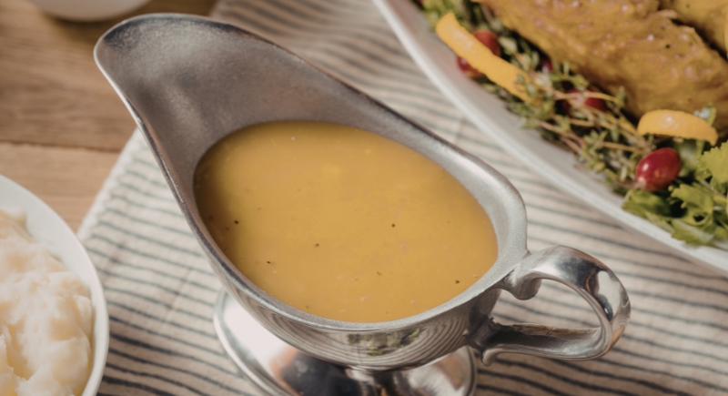 This gravy started with the heart, liver, gizzard, and neck that came inside the turkey. Each organ needed to be simmered in water with aromatics, then finely chopped. The pan drippings had to be whisked with flour, and the giblets were stirred in at the end to keep the pieces tender. Many holiday cooks spent nearly an hour turning those parts into gravy.