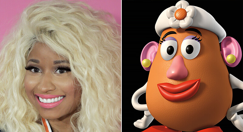A single photo from Nicki Minaj’s early music-video era can send people straight to Mrs. Potato Head. Here, the resemblance is impossible to miss. Fans love how both looks lean into color and personality, which keeps the side-by-side edits in steady rotation.