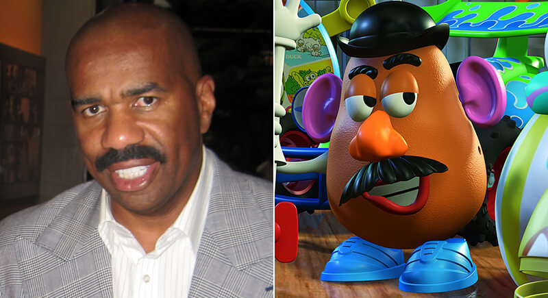 A wide open grin from Mr. Potato Head looks suspiciously close to Steve Harvey posing for a headshot. The smooth head, bold mustache, and dramatic expressions create a match that people rarely overlook.