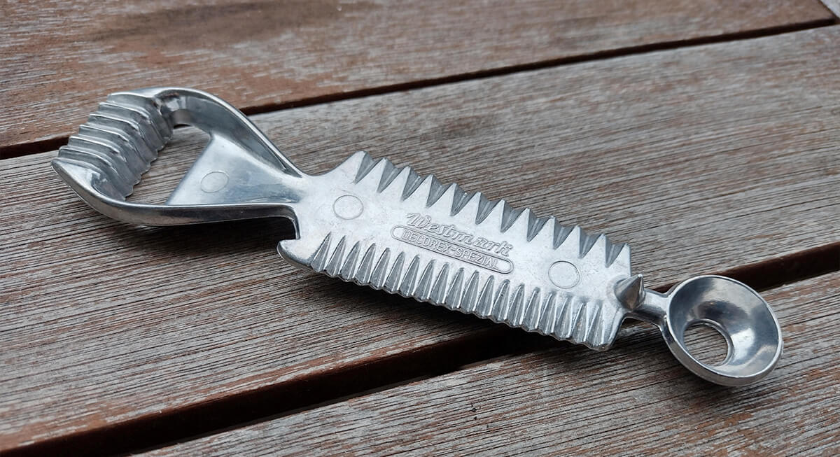 Presentation mattered in mid-century dining, and even butter received attention. A butter curler shaped cold butter into decorative curls or small rosettes. The tool featured a curved edge or serrated scoop that glided across the surface.