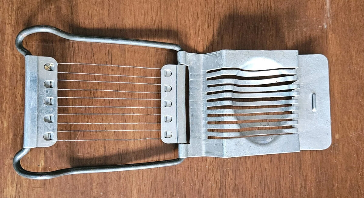 A hinged top pressed thin wires through a boiled egg, producing even pieces for salads or sandwiches. It was invented earlier, but widely used in the 1950s. Some models allowed cross-cutting for diced eggs. The clean cuts added a polished look without extra effort.