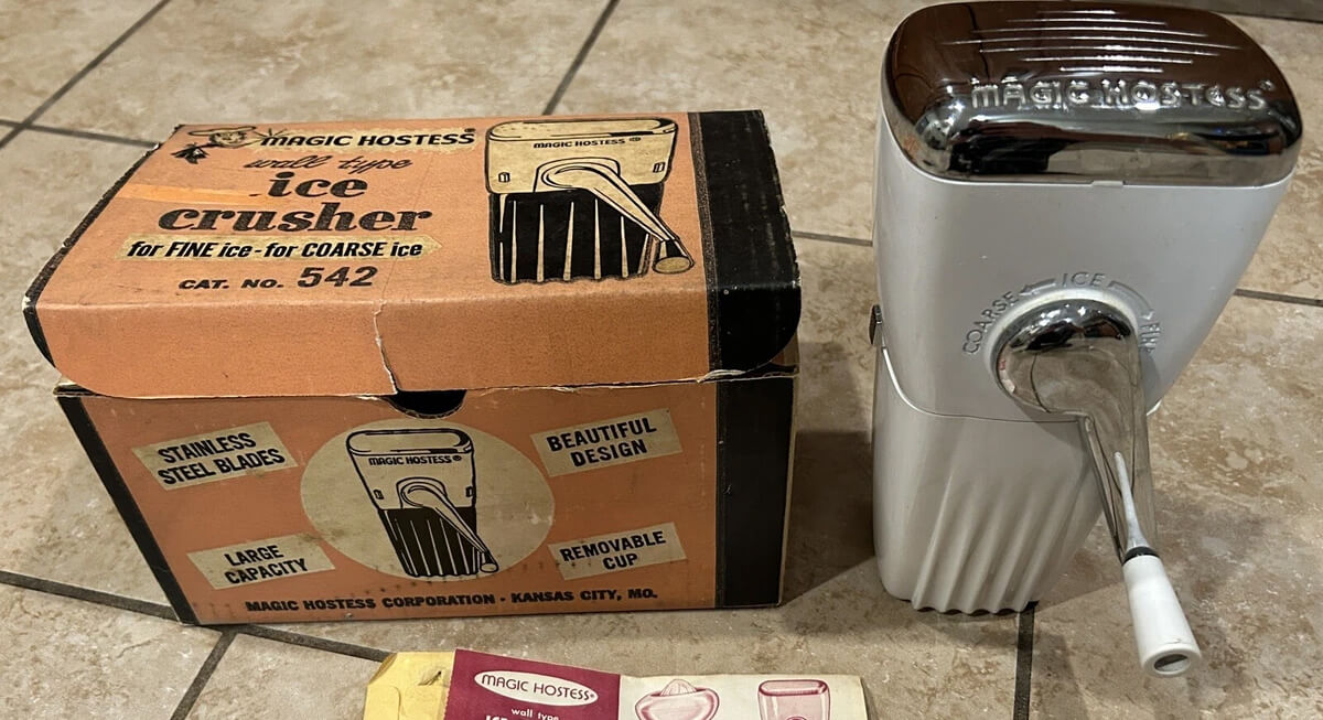 Before blenders could handle ice, this tool filled an important role for home bars. Most versions used a hand crank that pushed cubes through metal teeth into a container below. Crushed ice became essential for cocktails and cold desserts. The sturdy construction often included chrome finishes.
