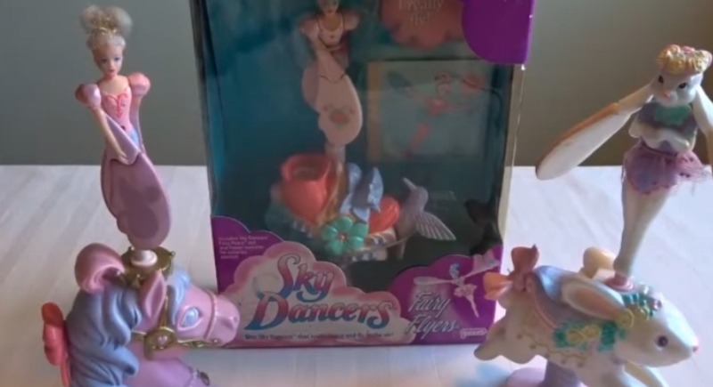 Sky Dancers were dolls that launched into the air when a player pulled a ripcord on the base. Their plastic wings spun rapidly and lifted the doll like a tiny helicopter. The toy often flew higher than expected and then drifted unpredictably around the room. Since the landing spot was hard to control, faces, lamps, and walls frequently ended up in the flight path. Many households reported bruises and eye injuries from the spinning dolls.