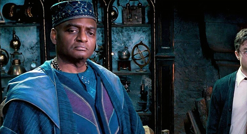 The books gave us only fragments: tall, bald, Black, with a gold earring. That was it. On-screen, George Harris transformed him into something unforgettable. He arrived at costume fittings wearing traditional Nigerian robes, and the filmmakers built on his idea. Rich fabrics, a gleaming hat, and his calm authority turned Kingsley into more than a background Auror; he became visually iconic, radiating wisdom and cultural depth the novels only hinted at.