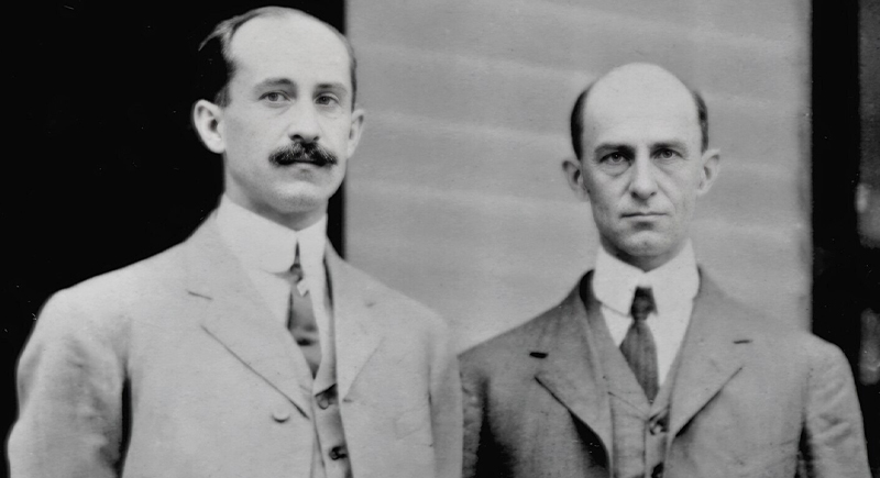 A 1909 image shows the brothers seated outside a building, looking ordinary. But just a few years earlier, they’d made the first powered flight.