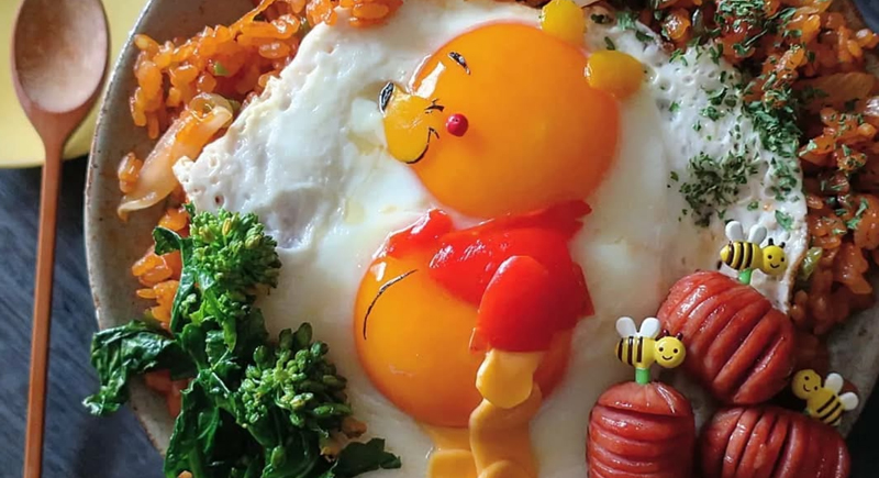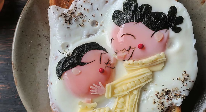 Etoni Mama transforms items like fried eggs, rice, and seaweed by cutting and arranging each piece to create familiar faces and objects. Usually, she utilizes only a single food item as the central element. For example, the egg yolk becomes a face or belly, while strips of seaweed define facial features.