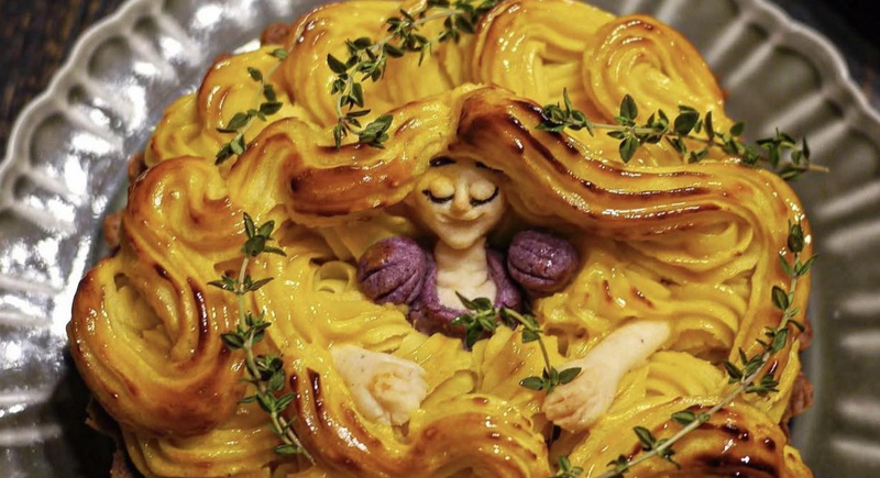 One meal shows a man handing mimosa flowers to a woman, made to recognize International Women’s Day. The entire scene is built with edible items arranged into a clear narrative. This design stands out because it reflects a real-world moment and demonstrates how her food art can convey a message using simple items to express appreciation and care.