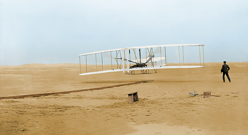 In 1903, Orville Wright took flight in a fragile wooden plane. Less than 45 years later, World War II pilots were flying jet fighters at incredible speeds. One of the first men to try to make flight a reality saw his dreams come true on a massive scale. Orville lived until 1948.