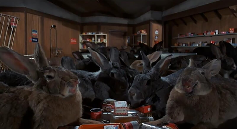 Rather than build elaborate effects, the crew filmed regular rabbits on miniature sets to simulate giant size. Ketchup was added for gore, and in some cases, actors wore rabbit costumes. Despite the unconvincing visuals, the commitment to practical techniques gave the film its offbeat, enduring cult appeal.