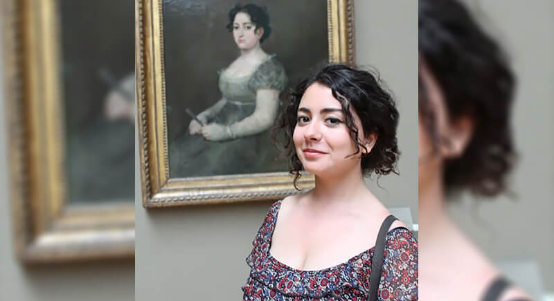This visitor could swear she found her great-great-grandmother hanging on the museum wall. The portrait, likely from the early 19th century, captures a woman of elegance and poise, holding what appears to be a letter or a fan. Standing beside her, the modern lookalike seems like her living continuation.