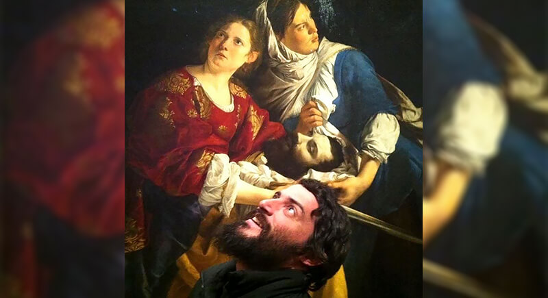 Talk about commitment to the bit. This museum visitor found his own severed head in a Baroque masterpiece. The painting, likely depicting Judith Beheading Holofernes, captures a dramatic biblical moment with intense realism. The man’s reaction below perfectly matches the decapitated figure’s features, beard, and all.