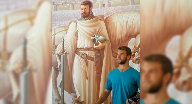 If Chris Hemsworth ever needs a stand-in for a medieval movie, this guy’s ready. The museum visitor in the bright blue T-shirt could easily be the living version of the knight behind him. The painting captures a noble warrior holding his helmet beside a horse, yet the resemblance is so uncanny it feels like the visitor just stepped out for coffee before his next crusade.