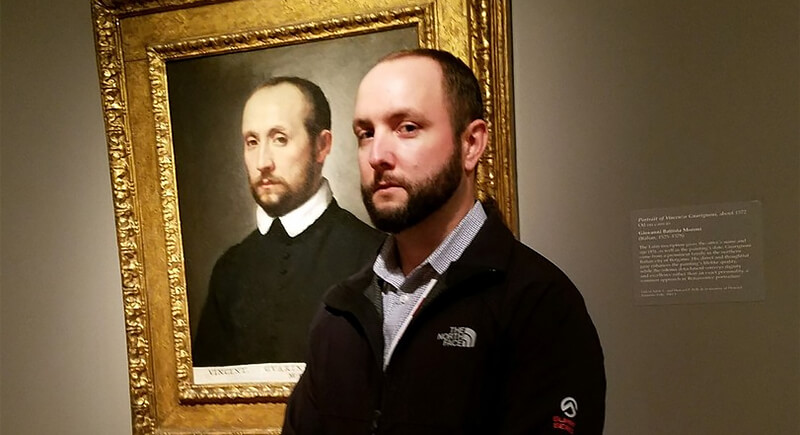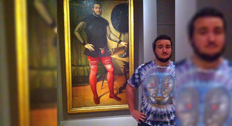 This visitor certainly knows how to make an entrance, but we can’t help wondering if he’s ready to fully embrace his doppelgänger moment. The 16th-century nobleman in the portrait, wearing bold red tights, a leather tunic, and a confident pose, could easily be mistaken for the modern man standing beside him, especially if the modern visitor swapped out his tie-dye for a pair of similar tights.