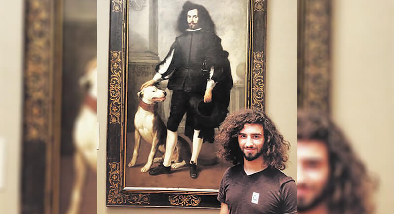 Some doppelgängers are all in the details, and in this case, it’s the hair that seals the deal. The guest could easily be mistaken for the man in the 17th-century portrait, painted by Spanish master Diego Velázquez. Both sport wild curls, beards, and that same confident posture beside a loyal greyhound.