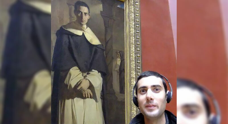 It’s hard not to do a double-take here: the resemblance is almost unsettling. This museumgoer looks like he stepped straight out of the painting beside him, dressed in headphones instead of a monk’s robe. The artwork, likely from the 1800s, captures a Dominican friar deep in thought, and the modern twin mirrors that calm focus perfectly.
