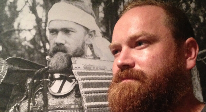 This modern visitor found his historical double in a 111-year-old samurai portrait. The match is undeniable. The man, obviously amused by the likeness, jokes about being a time-traveling armor collector.