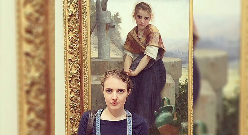The woman in front of the painting appears to have stepped straight out of it with the same expression, posture, and even hairstyle. The artwork in the background is “The Broken Pitcher” by 19th-century French painter William-Adolphe Bouguereau, renowned for his detailed, lifelike portraits that idealized rural youth and innocence.