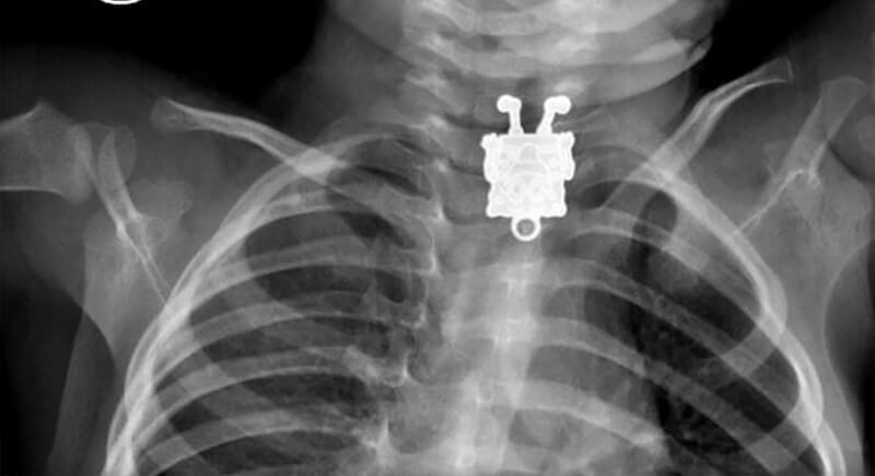 Doctors reviewing a toddler’s X-ray didn’t expect to see SpongeBob’s face staring back. It turned out to be a small pendant from his sister’s jewelry. Though the pendant rested in his throat, the child showed no distress. Using a camera and small forceps, the medical team safely extracted it.