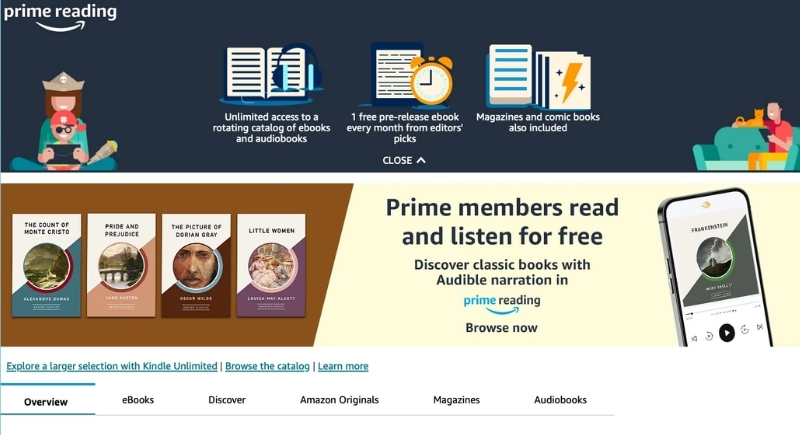 Prime Reading is like a small Netflix shelf, but for books and magazines. Members can borrow from a rotating selection of eBooks, magazines, and comics at no extra cost. It’s not the entire Kindle store, sadly, but the perk features content perfect for casual reading, travel downtime, or anyone who claims they don’t have hobbies.