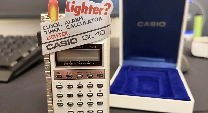 The device is best known as the Casio QL-10, sometimes called the “calculighter.” It combined a working digital calculator with a refillable butane lighter inside the same handheld body. Press the buttons on one side, flip it around, and it could produce a flame.